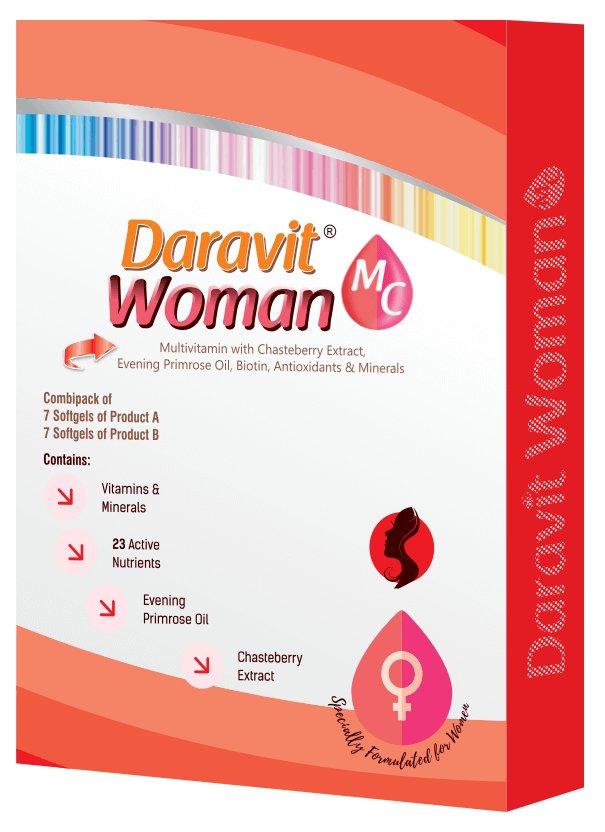 Daravit Woman MC is a gender-specific multivitamin and mineral supplement thoughtfully formulated to provide complete period care and hormonal support. Enriched with Evening Primrose Oil and Chasteberry Extract, it helps ease menstrual cramps, balance hormones, and promote comfort throughout your period.